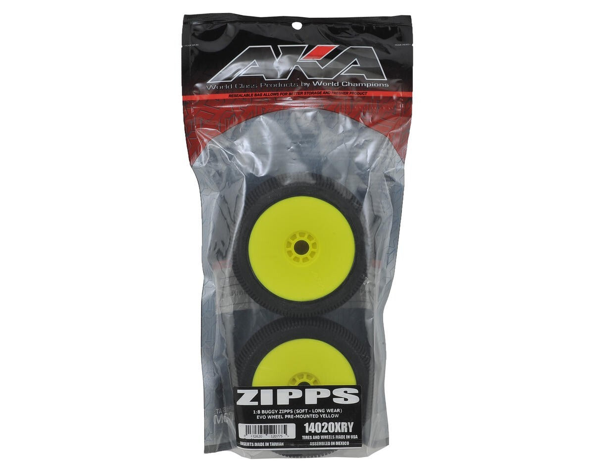 AKA EVO Zipps 1/8 Buggy Pre-Mounted Tires are designed with durability and stability in mind, perfect for today's high wear and high grip tracks. The ZIPPS features a very dense symmetrical block tread pattern with a center staggered rib. The dense block pattern puts as much rubber on track as possible while still allowing dust to clear from the tire patch. This enables superior wear and stability while remaining controllable off line in the dust. The center rib decreases rolling resistance on the straights and creates a very stable platform in the center of the tire. AKA also updated the block design to allow for more deflection. This allows the block to flex a bit more front to rear to gain forward bite while still remaining stable side to side.