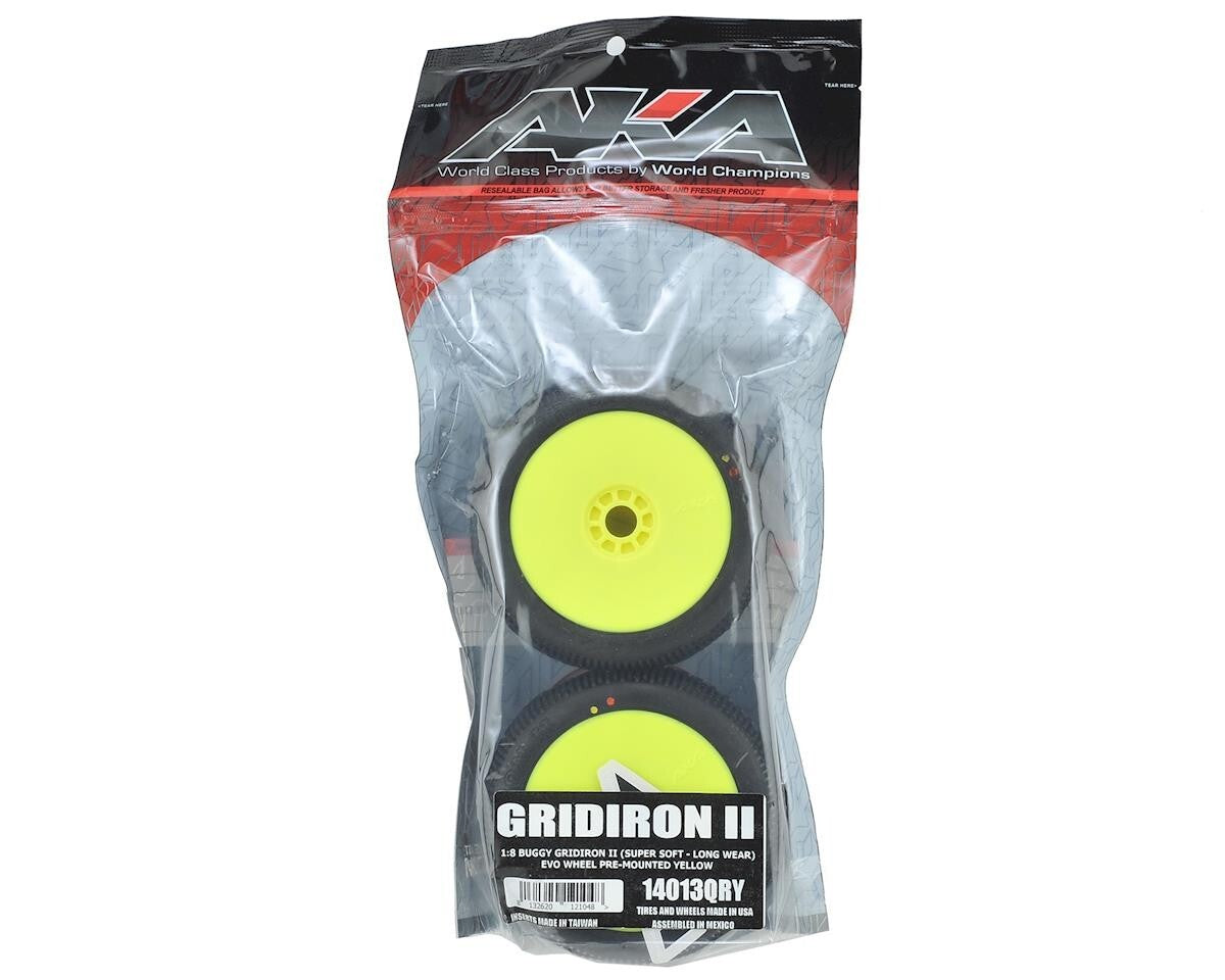 This is a set of two AKA Racing Grid Iron II 1/8 Scale Off-Road Buggy Tires, pre-mounted on yellow EVO wheels. The Grid Iron II uses the same carcass as the World Championship winning Impact tire, with the addition of added waffle ribbing to help control tire expansion and angled side pins for better performance on rougher tracks. This created a tire that is 5% lighter than the original, with improved improving acceleration and all-around performance.