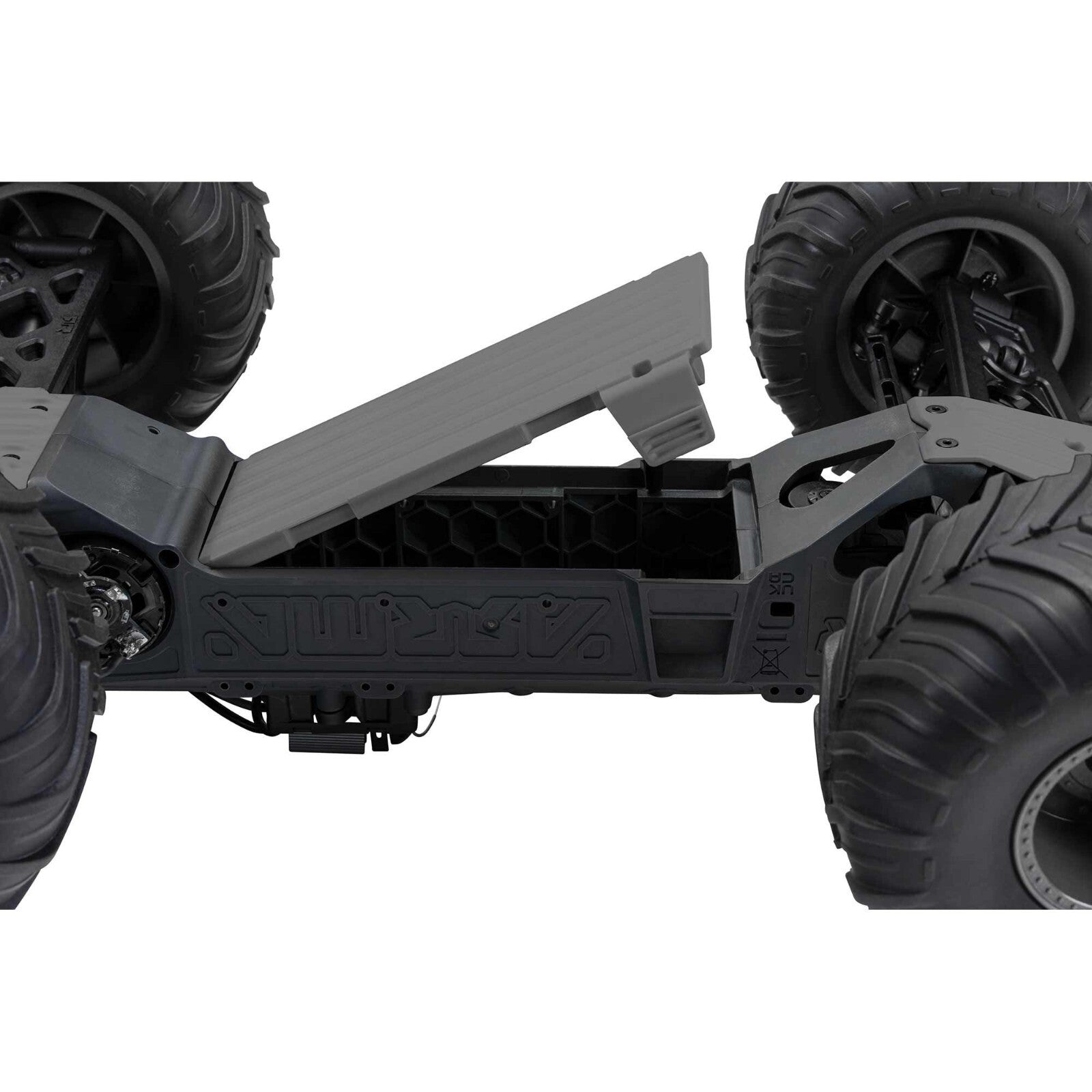 Go ahead and send it over punishing tracks. Proven ARRMA engineering gives the composite chassis bash-it-all durability. The independent suspension, oil-filled shocks, and adjustable ride height combine to provide a smooth ride over rough terrain. For unstoppable traction, the ARRMA GORGON MT monster truck's 2WD transmission moves power from the MEGA 550 motor to massive rubber dBoots® Chevron tires on tough nylon wheels. Its metal gears are tough enough to take on brushless power, too.
