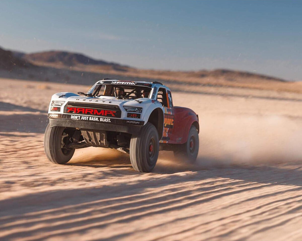 A LiPo battery pack and charger are all that you’ll need to complete the 1/8 scale ARRMA MOJAVE 4S BLX 4X4. Pop in a charged pack and prepare for amplified, all-road ARRMA blasting, desert truck style!