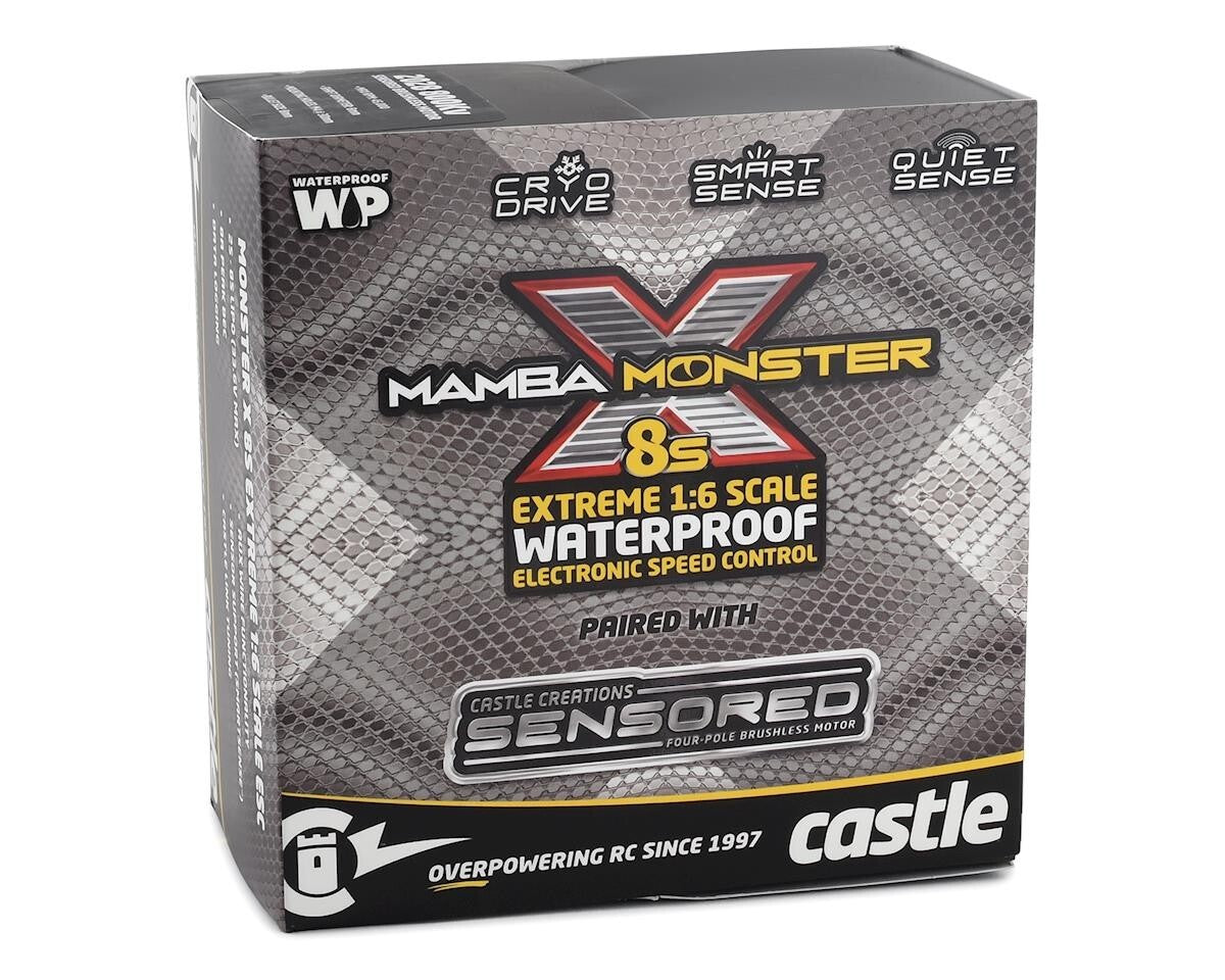 The Castle Creations Mamba Monster X 8S 1/6 ESC/Motor Combo with 2028 Sensored Motor is a great way to take your build to the next level with Castle’s cutting edge sensored large scale brushless power. The MAMBA MONSTER X 8S COMBO is ready to power any R/C vehicle weighing up to 25lbs, and running all the way up to 8S LiPo. This motor and ESC combo is designed for heavy, high speed rigs, and you'll experience smooth low-end control, without sacrificing power, punch, or speed.