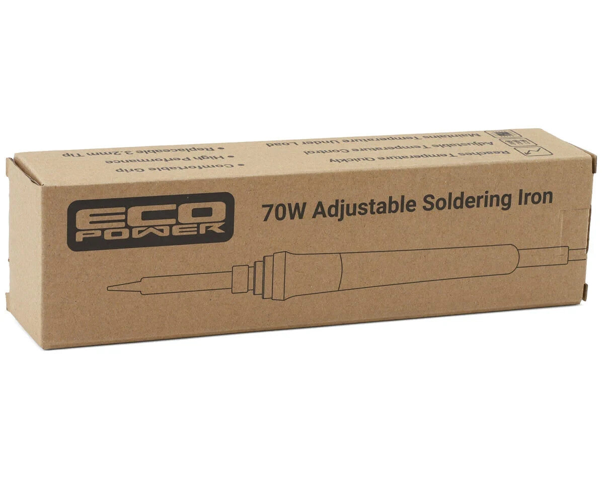 Introducing the 70W Adjustable Temperature Soldering Iron by EcoPower. This high-performance soldering iron is designed for precision work with an adjustable temperature range to suit a variety of projects. Its robust 70W output and reliable PTC ceramic heater ensure rapid heat-up and consistent performance. Perfect for professionals and hobbyists alike, it combines power, precision, and ease of use in one versatile tool.