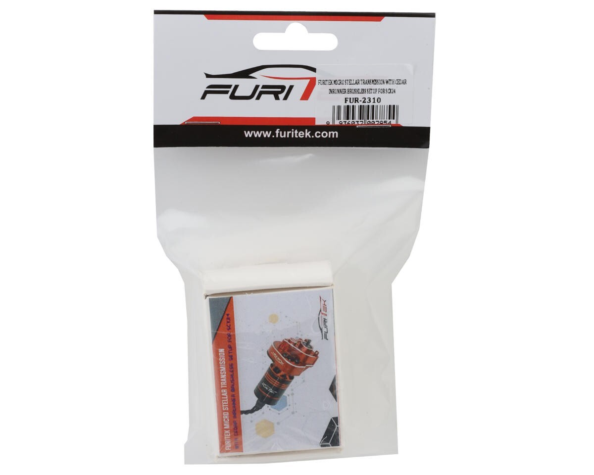 Furitek Axial SCX24 Micro Stellar Transmission With Cedar Brushless Inrunner Motor. Designed specifically for the SCX24, this combo features a stylish anodized with red and black aluminum case, precision machined steel gears and high quality ball bearings to ensure smooth operation! When it comes to the motor, the Furitek Inrunner CEDAR 1825 3456KV brushless motor incorporates the awesome reliability and amazing performance we all loved of the Outrunner motors but in the form of a sealed can version! making it dust and waterproof! you no longer have to worry about the outside of the motor needing clearance to spin anymore! Easy to be installed in any frame without worrying about touching wires or parts like the counterpart Outrunner motors! Get this transmission and motor combo and experience the amazing crawling performance and reliability of the Stellar and Cedar!