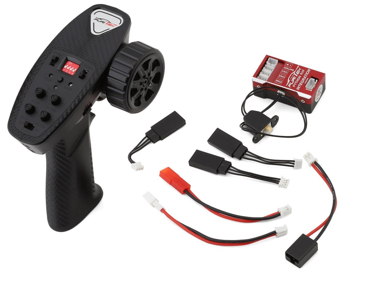 Furitek Python RXF 40A/70A Integrated Brushless ESC and Receiver Combo with Kosmik Transmitter. The perfect 2-in-1 plug-and-play solution for your 1/24 and 1/18 micro rock crawlers where space is extremely limited! Features a Big BEC for power-hungry servos, FOC (Field-Orientated control technology) with super slow and ridiculously smooth throttle control and a CNC-machined water and dustproof case! This easy drop-in brushless conversion for most of micro crawlers eliminates the need for an external receiver unit to upgrade your rig with a brushless power system! In addition, this combo is compatible with stock FX118, FMS18 and Hobbyplus 1/18 transmitters and includes SCX24, JST and TRX-4M battery connectors, ensuring compatibility with the most popular platforms on the market!