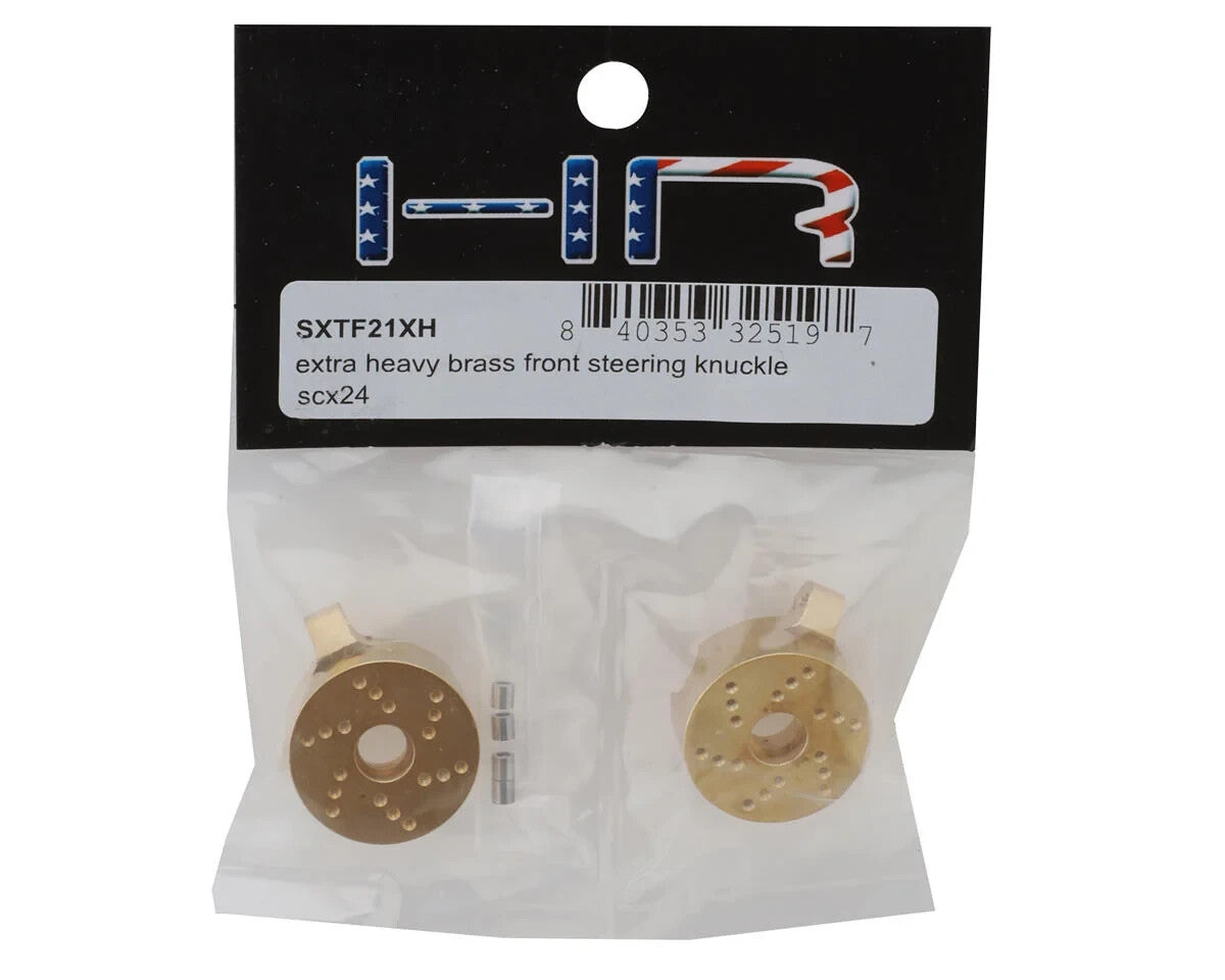 Hot Racing Axial SCX24 Extra Heavy Brass Front Steering Knuckles. Constructed from CNC-machined high quality brass, these optional steering knuckles are intended for the SCX24 and AX24 platforms to add 39.4g of total unsprung weight to lower the CG (Center of Gravity) for enhanced crawling performance, all while increasing durability and reliability over the stock composite knuckles! Making these steering knuckles the ultimate upgrade for your AX24 and SCX24 platforms.