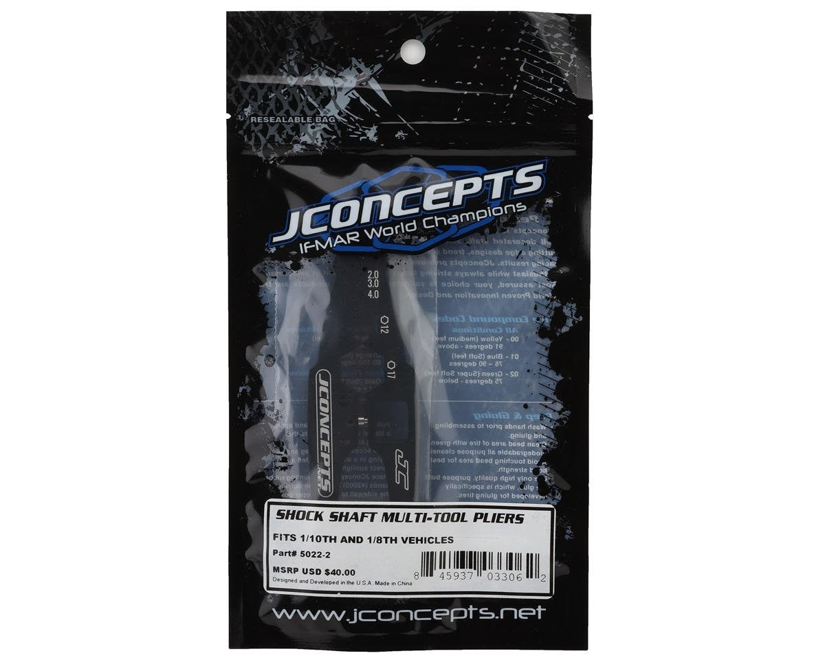 The JConcepts Shock Shaft Multi-Tool Pliers are the ultimate all-in-one tool for your RC builds and rebuilds. With features like shock shaft holding, hex clamping, bullet plug placement, and pivot ball popping, this lightweight aluminum tool handles it all with precision and ease.