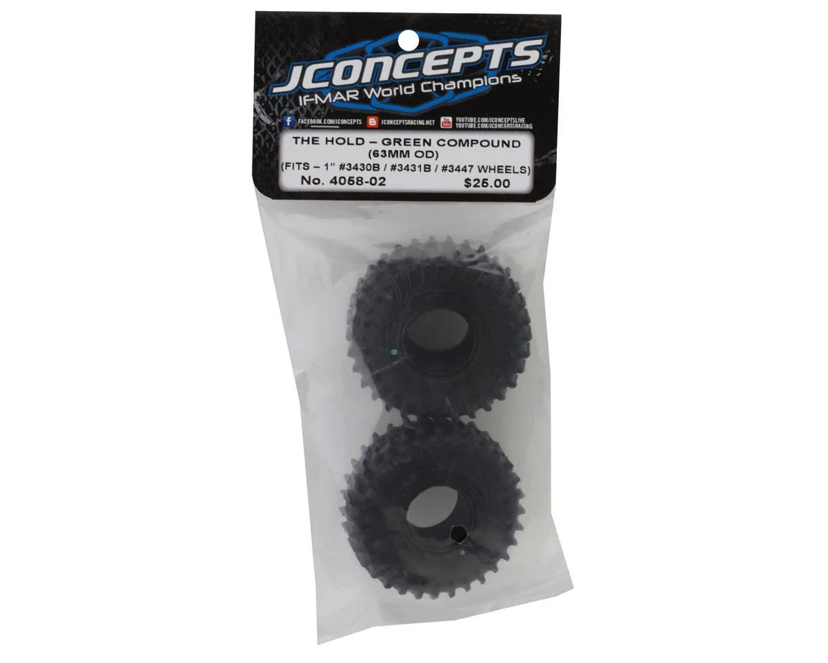These 63mm JConcepts tires add super scale appearance to 1/24th scale off-road crawlers. The sidewall design of The Hold is captivating, featuring peaks at the outer edges and a finely detailed alternating tread pattern that provides distinct edging. Strategically placed design features offer enhanced flexibility where required.