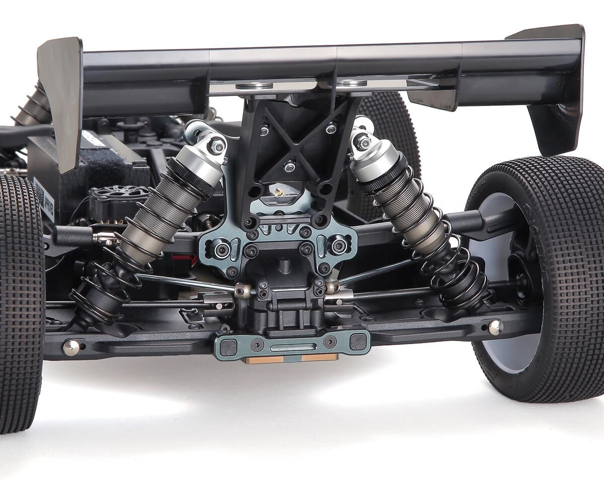 The MBX8R ECO uses updated narrow "C" and "D" pivot blocks with pivot inserts for increased tuneability. Longer box-shaped suspension arms can be paired with optional inserts allowing for suspension arm tuning. The molded rear uprights have CFRP plates to adjust the rear roll center.