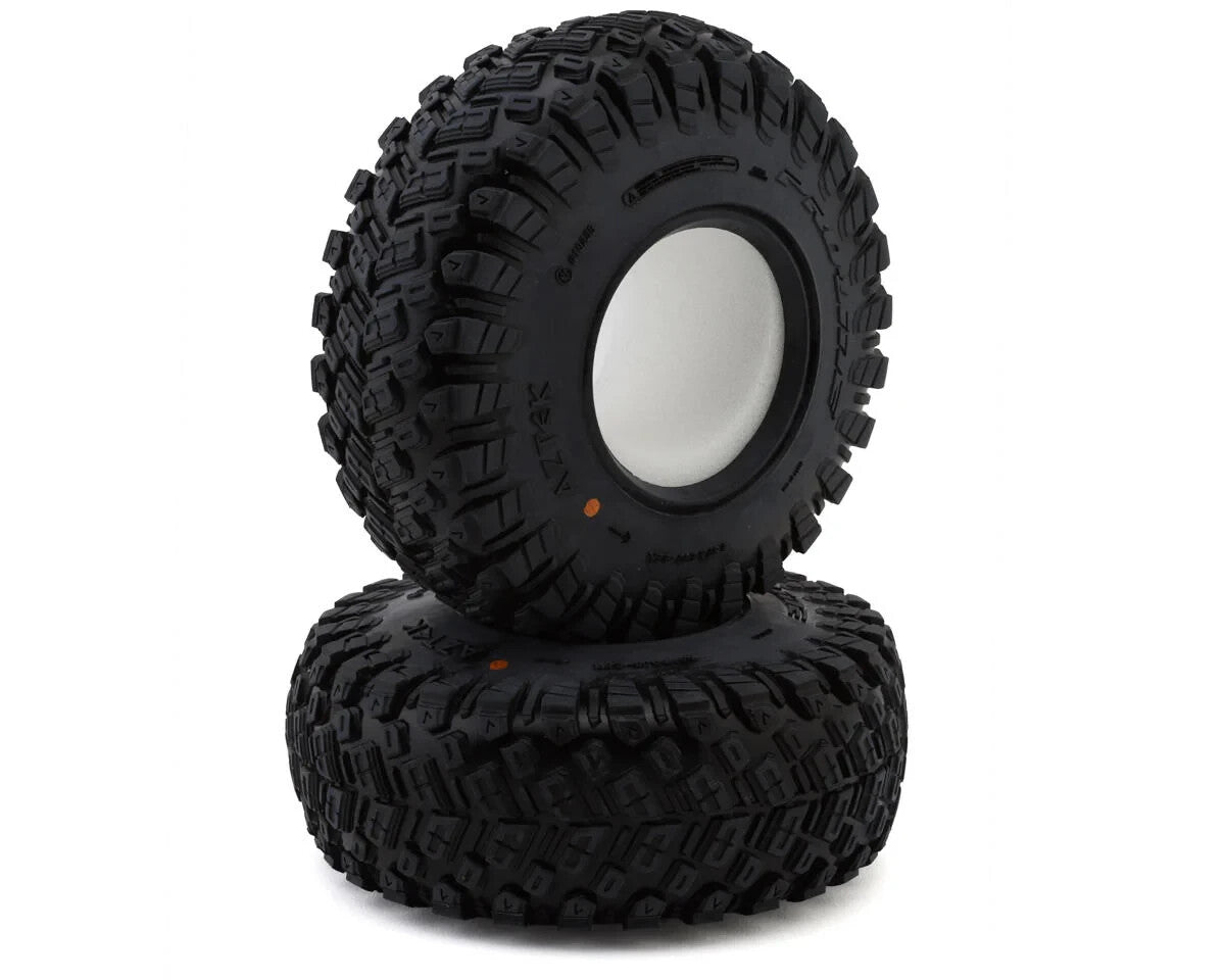 This is a pair of Aztek 2.2" Rock Crawling Tires. A revolutionary RC rock-crawling tire designed to redefine off-road performance standards. The Aztek boasts a chevron-shaped, stepped lug tread design, fortified by heavy-duty sidewall lugs with siping for enhanced side-hilling capabilities. This tire is meticulously crafted to conquer any terrain, offering exceptional forward bite in wet or dry, abrasive or slick conditions. The Aztek's innovative design extends beyond its tread pattern with a honeycomb-shaped inner carcass reinforcement, it ensures optimal sidewall stability! Precision-engineered for responsive handling, the Aztek caters to enthusiasts seeking unparalleled performance and reliability in challenging off-road environments. Whether navigating steep inclines or tackling rugged terrain, the Aztek empowers RC enthusiasts to push the boundaries of exploration with confidence and precision!