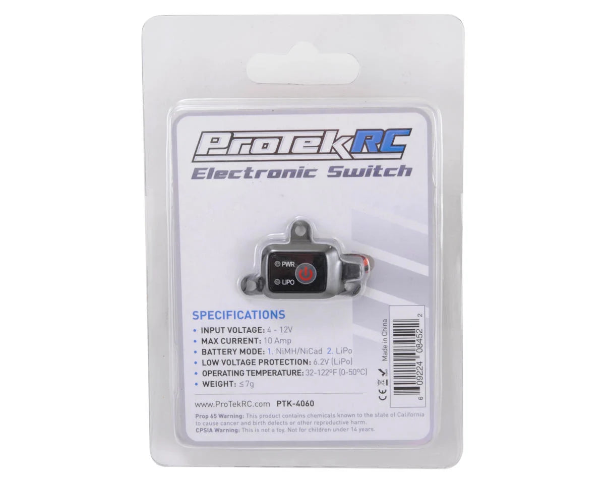 This is the ProTek R/C Electronic Switch. The ProTek R/C Electronic Switch is a lightweight and compact MCU controlled digital ON/OFF switch for your radio controlled model. With the push of a button this digital electronic switch eliminates the problems with intermittent contact associated with mechanical switches. This ProTek R/C Electronic Switch can be easily mounted to the transponder mount of your model or any other suitable location using double-sided tape (optional bottom covers are included).
