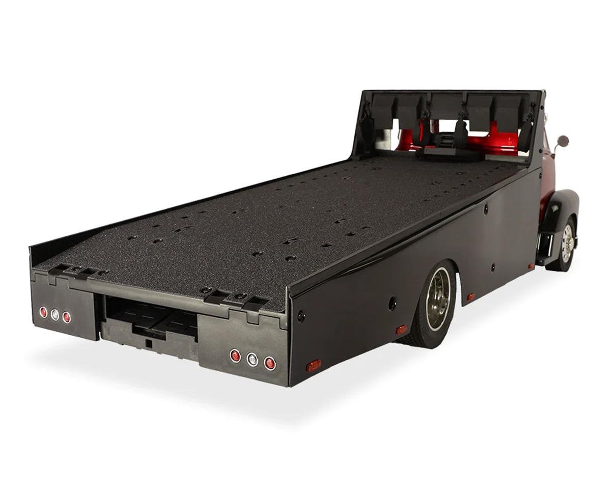 • The bed features an anti-skid surface, wheel chocks, and tie-down straps to securely transport your precious RC vehicles. The cleverly concealed easy-load battery box adds to the convenience.