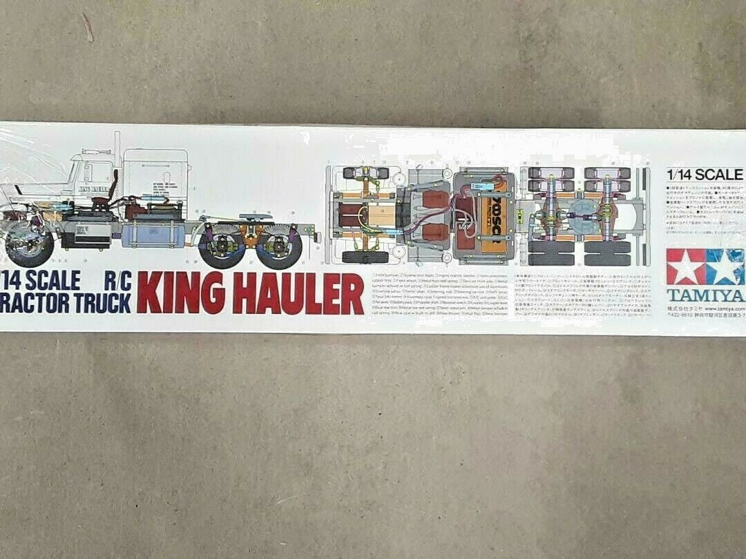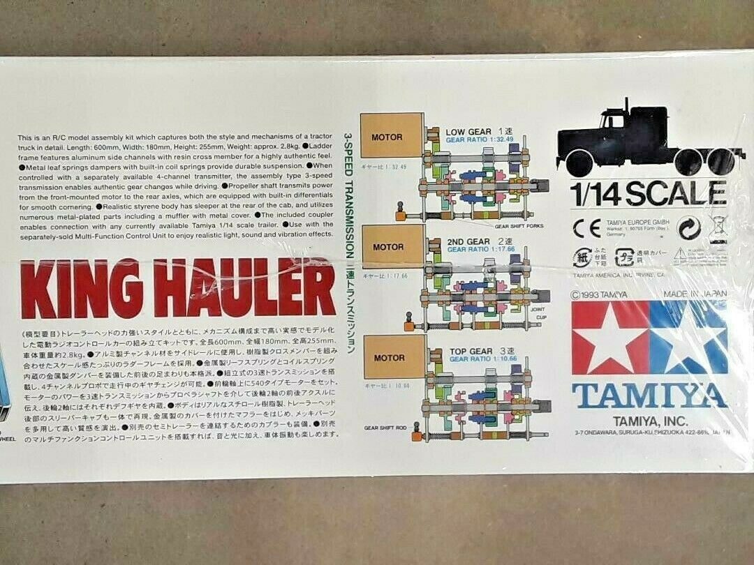 The Tamiya 1/14 King Hauler Black Edition Semi Tractor Kit features a precision-molded tractor truck body with pre-painted metallic black parts offset by chrome-plated parts such as the front grille, air cleaners and more. The tough ladder frame chassis is paired with front and rear metal leaf spring dampers for excellent performance and durability. The front-mounted motor provides power to the rear wheels via propeller shaft, mirroring the system used on actual road-going trucks, and utilizes a 3-speed transmission with manually-controllable gear changes.