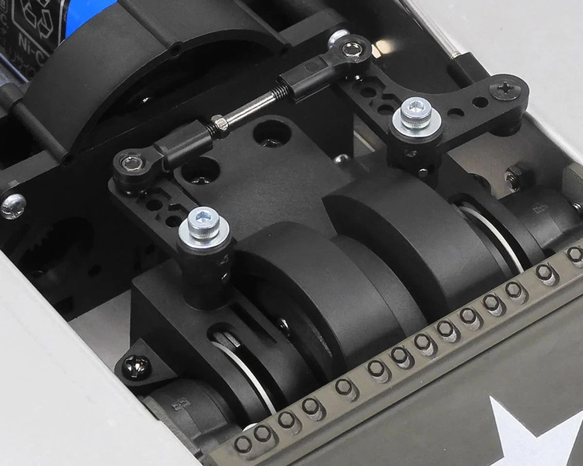 Equipped with a realistic mechanical steering system, this RC tank replicates the Sherman’s Cletrac-controlled differential setup. A Type 540 motor drives the system while servo-activated brake discs slow one track to initiate turns, recreating the tank's smooth, brake-free steering without power loss. This setup ensures authentic maneuvering with simplified operation through a standard wheel-type transmitter.