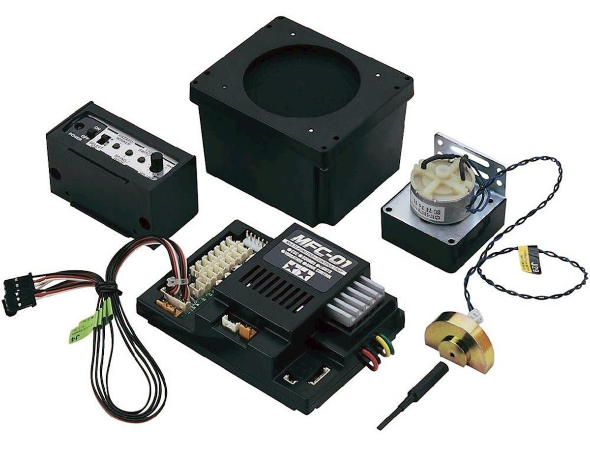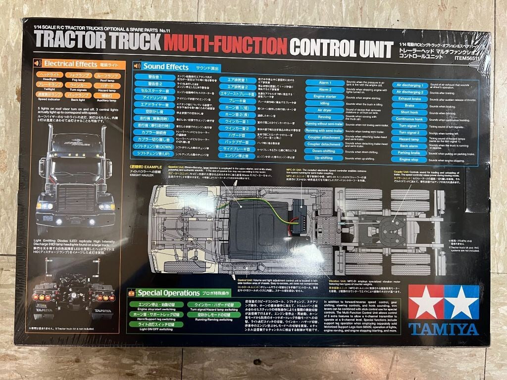 The Tamiya 1/14 Semi Truck Multi Function Unit provides incredible sound and action options for Tamiya's Knight Hauler or any other 1/14-scale RC Tractor Truck. It offers 24 sounds that have been digitally recorded from a powerful full-scale truck. Not only does the Control Unit control sounds like air brakes, engine idling, coupler connection and more, it also works lights, turns power on and off, functions as a low-speed electronic speed control, vibrates and many more realistic functions.