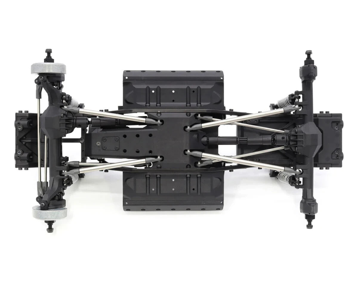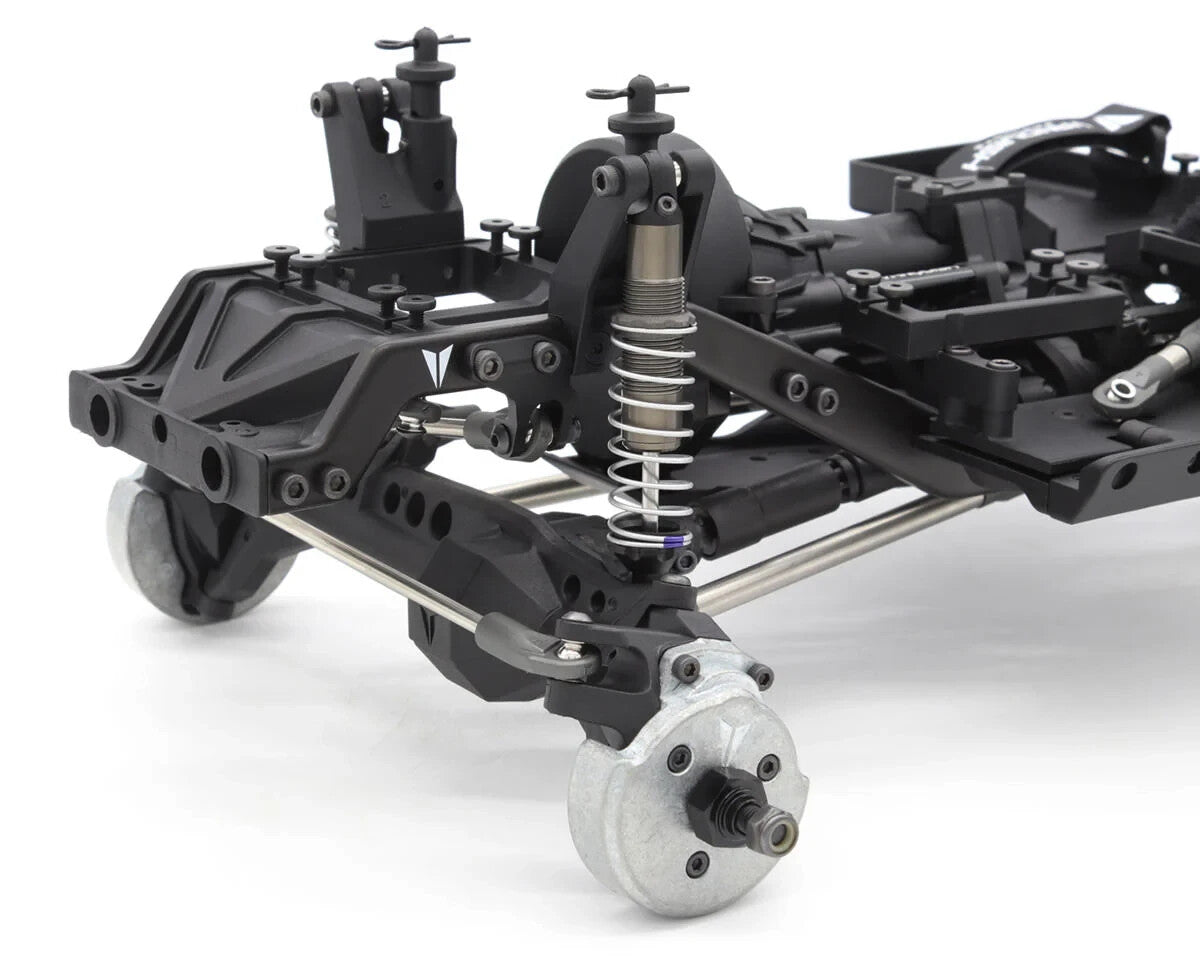 The VS4-10 Chassis blends scale realism with high-performance durability, utilizing a heavy-duty steel C-channel frame that provides exceptional rigidity and strength. Designed to endure extreme terrain challenges, it maintains accurate scale proportions while ensuring an optimal weight balance for superior handling. The molded front and rear cross members reinforce key stress points while also incorporating dual servo mounting locations, integrated winch line routing, and a detailed scale fuel cell. Molded rock sliders with replaceable outer sections allow easy adaptability for various body widths while adding a layer of protection against obstacles. Additionally, the machined aluminum panhard mount ensures precise and reliable steering geometry, while the molded shock towers secure the 80mm Incision S8E shocks in a sturdy double shear configuration, enhancing durability under extreme driving conditions.